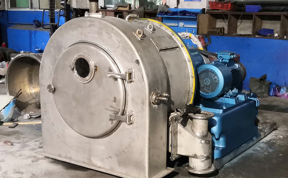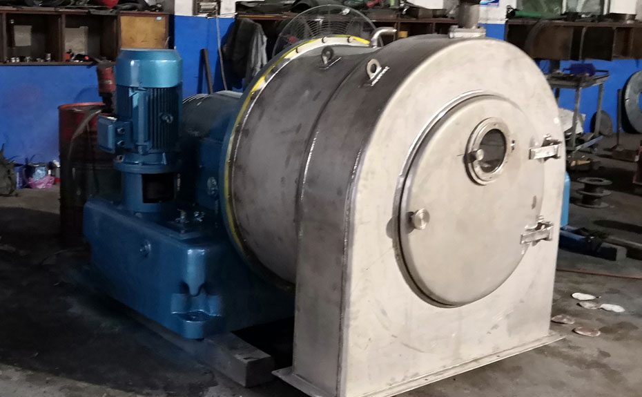 懸浮液由加料管加入裝在推料盤上的圓錐形布料斗中,在離心力作用下懸浮經(jīng)推料盤與布料斗之間空隙被甩到篩網(wǎng)上,在這里液體經(jīng)篩網(wǎng)縫隙和轉(zhuǎn)鼓上小孔甩出轉(zhuǎn)鼓外,流到母液收集器,而固相在篩網(wǎng)上形成濾渣層,因推料盤不斷地往復(fù)運(yùn)動形成的濾渣層沿轉(zhuǎn)鼓軸向不斷地被向前推移,而最后被推出轉(zhuǎn)鼓至前機(jī)殼的出料口。